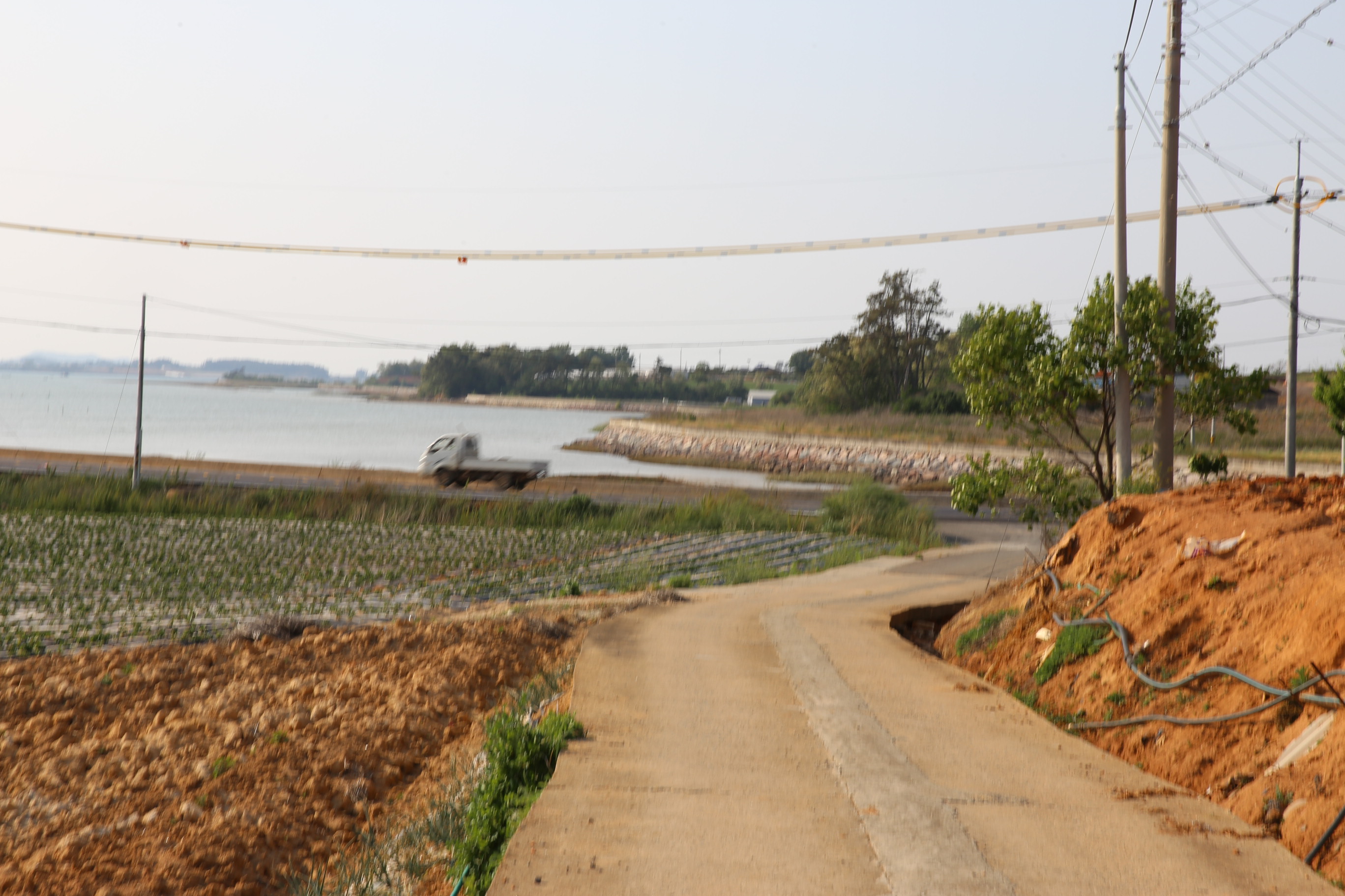 *좌.우의 시야가 시원하게 보이는 농로길 진행 왼쪽으로 푸른 바다가 보이고 우측으로 마을과