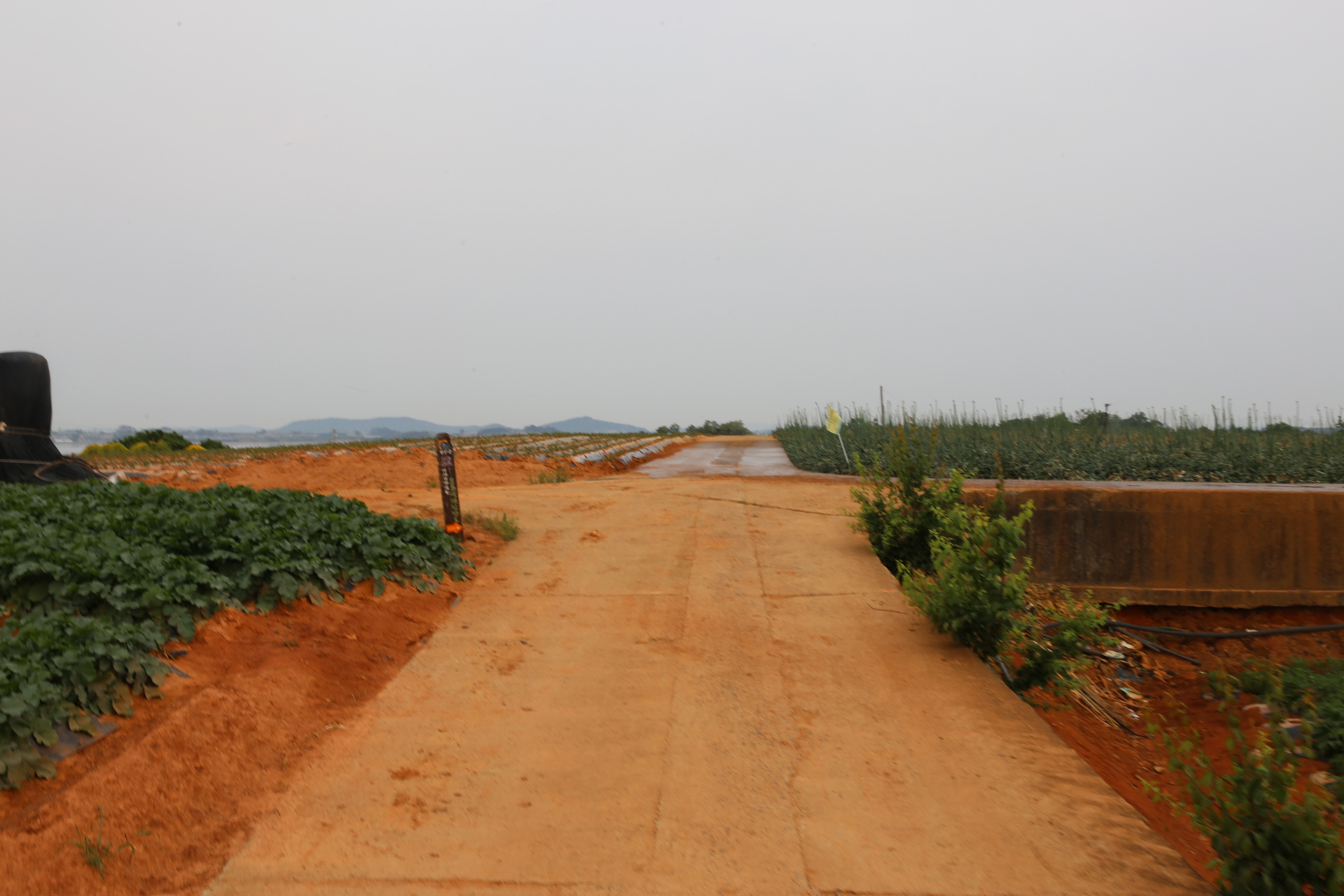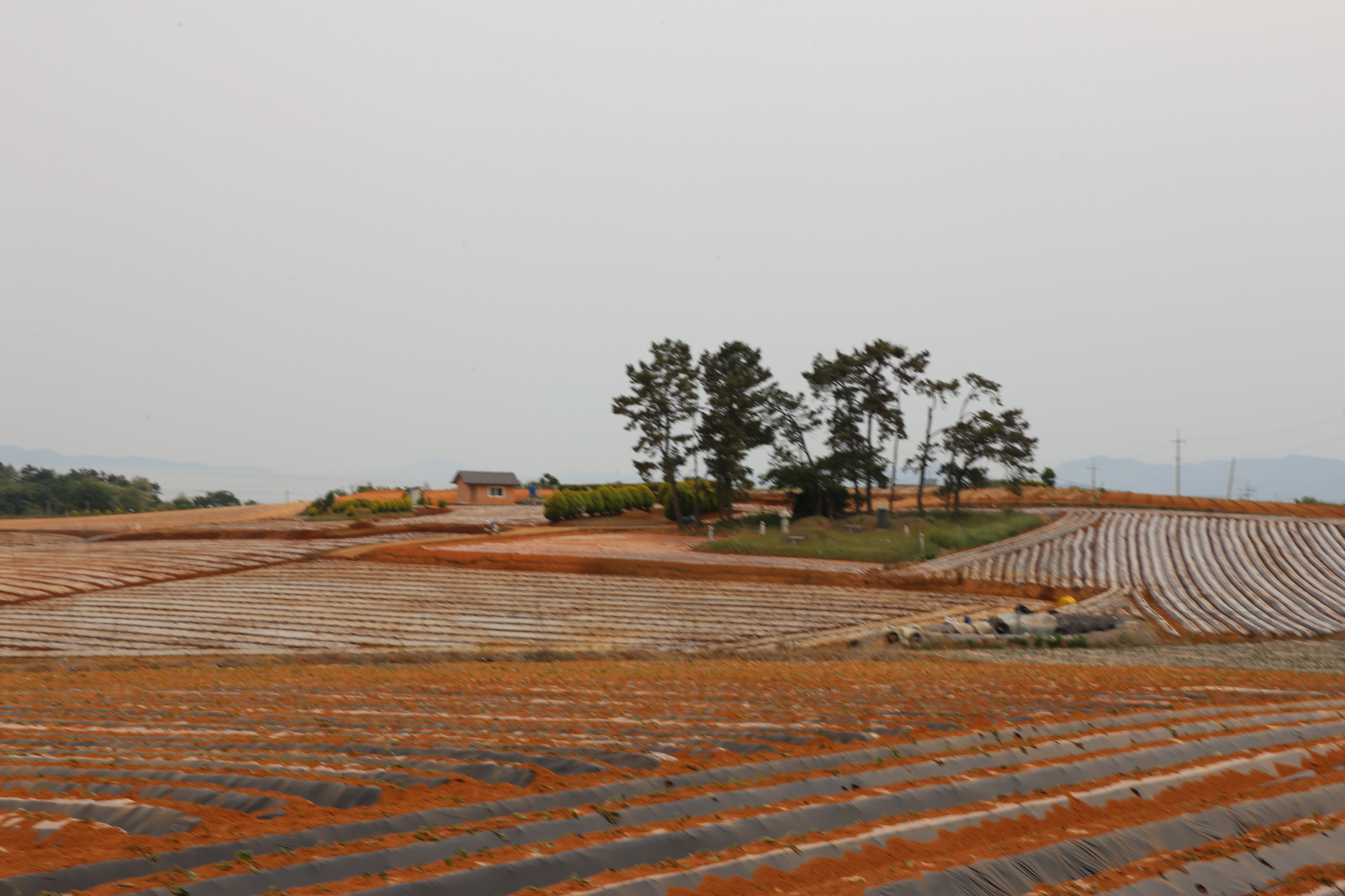 *끝없이 평쳐진 붉은 황토밭의 고구마 묘종 이식이 끝난 밭의 모습.