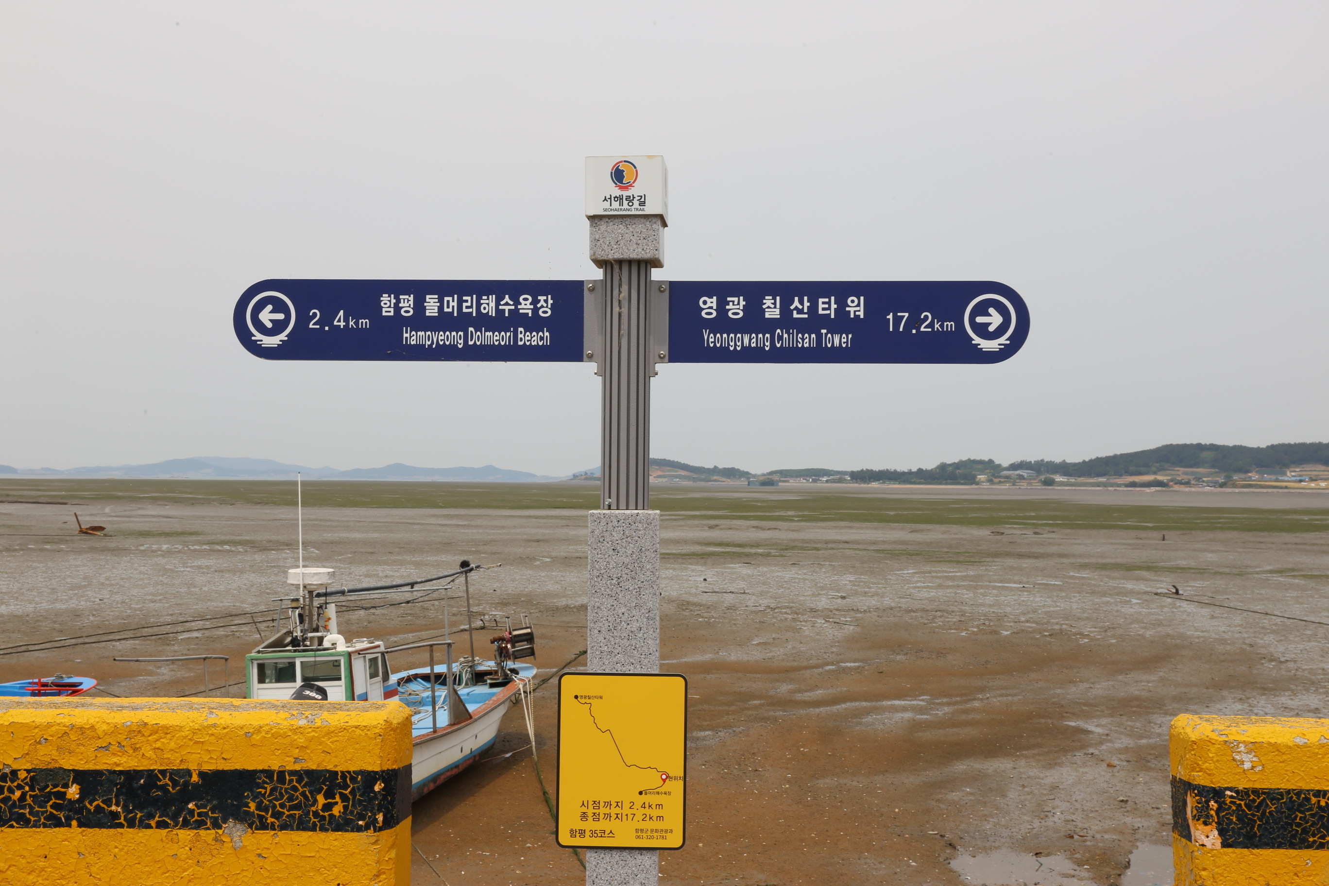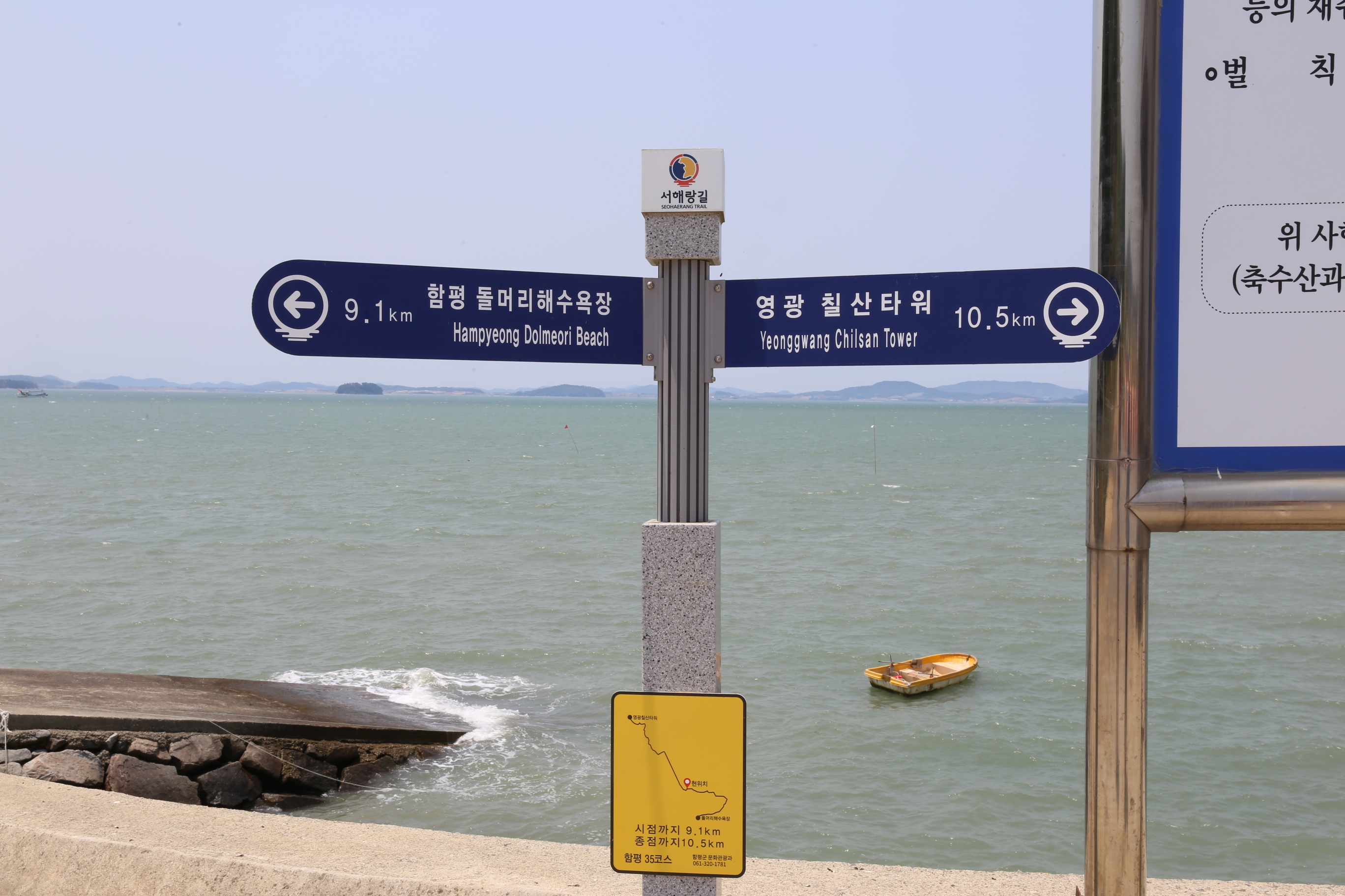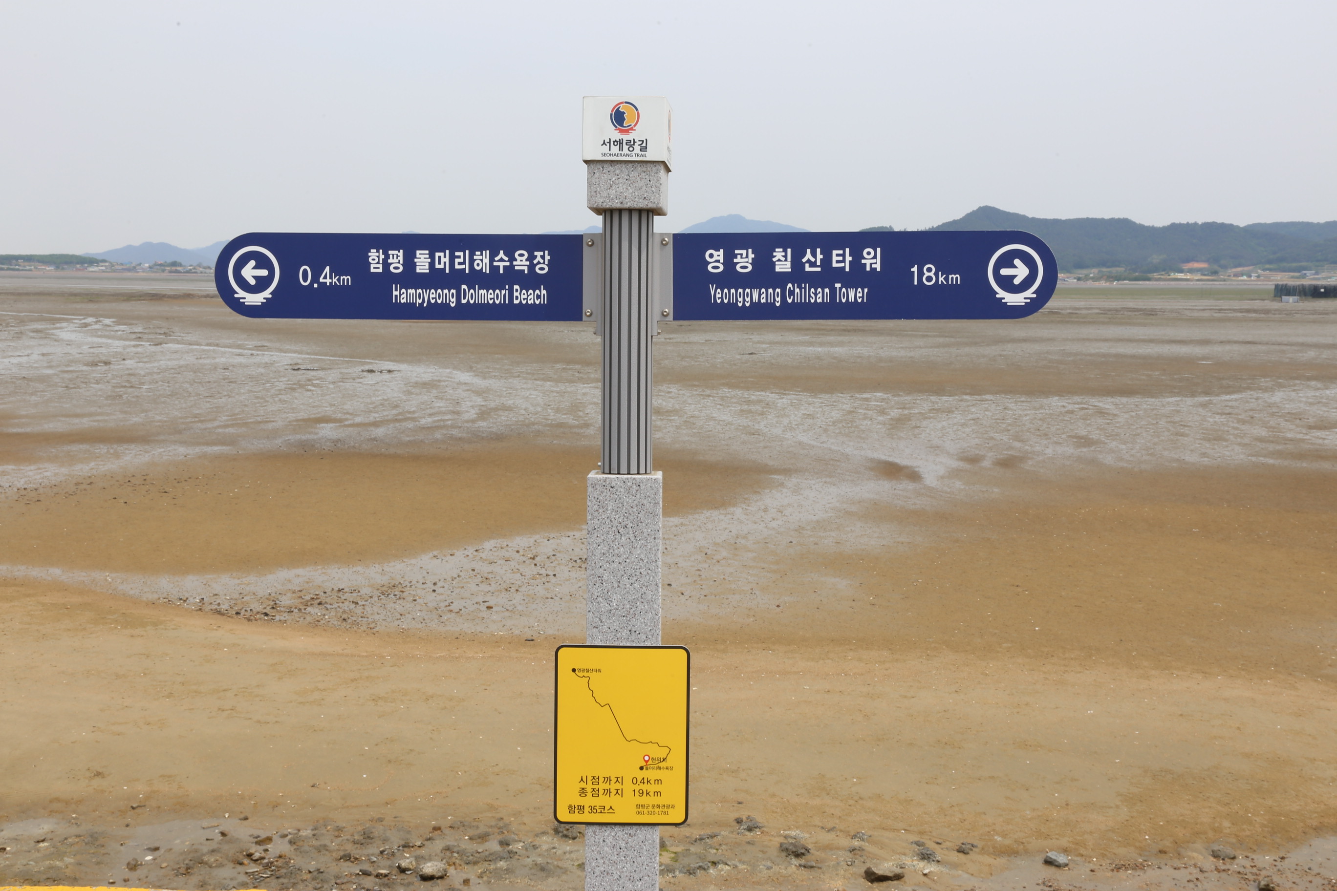 35코스 19km, 6시간, 돌머리해변~811번 지방도~주포로~주포항~형제수산민박~함평신흥해수찜~함평주포해수찜~석산로~해성교회~석창2리마을회관 입구~농암골~일공구횟집~월천방조제~안악횟집~안악길~안악해변~학산길~함평항길~함평항~향화로~향화도항~칠산타워