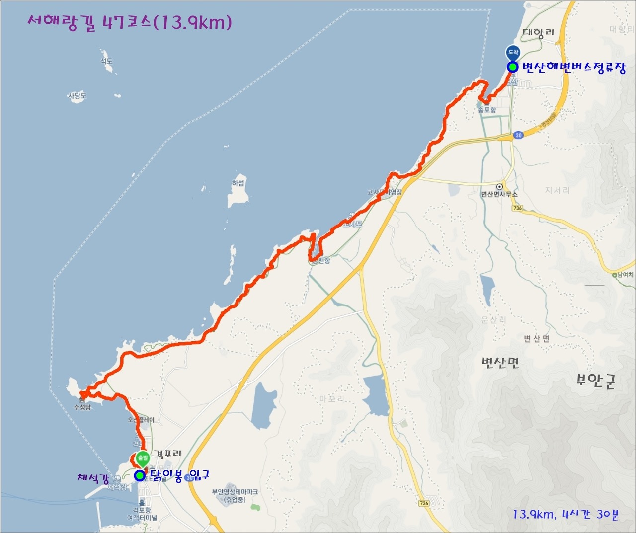 47코스 13.9km, 4시간30분, 닭이봉입구~변산반도국립공원사무소~바다호텔~채석강길~격포해변~오션플레이~죽막동해양생태관찰지~죽막길~후박나무군락~수성당~적벽강~변산해변로~카페909~바다갈라지는 곳~하섬전망대~고사포~성천항~고사포해변~고사포야영장~해피트리가족호텔~바라한펜션~송포항~송포출장소~변산해변버스정류장