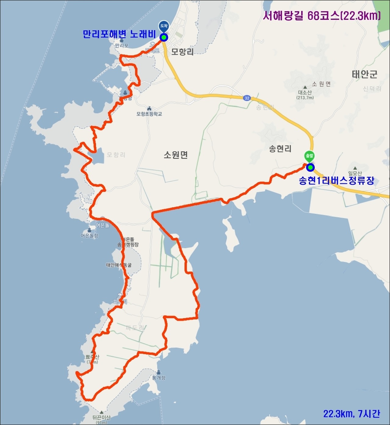 -종점 = 태안군 소원면 모항리 만리포해변 노래비