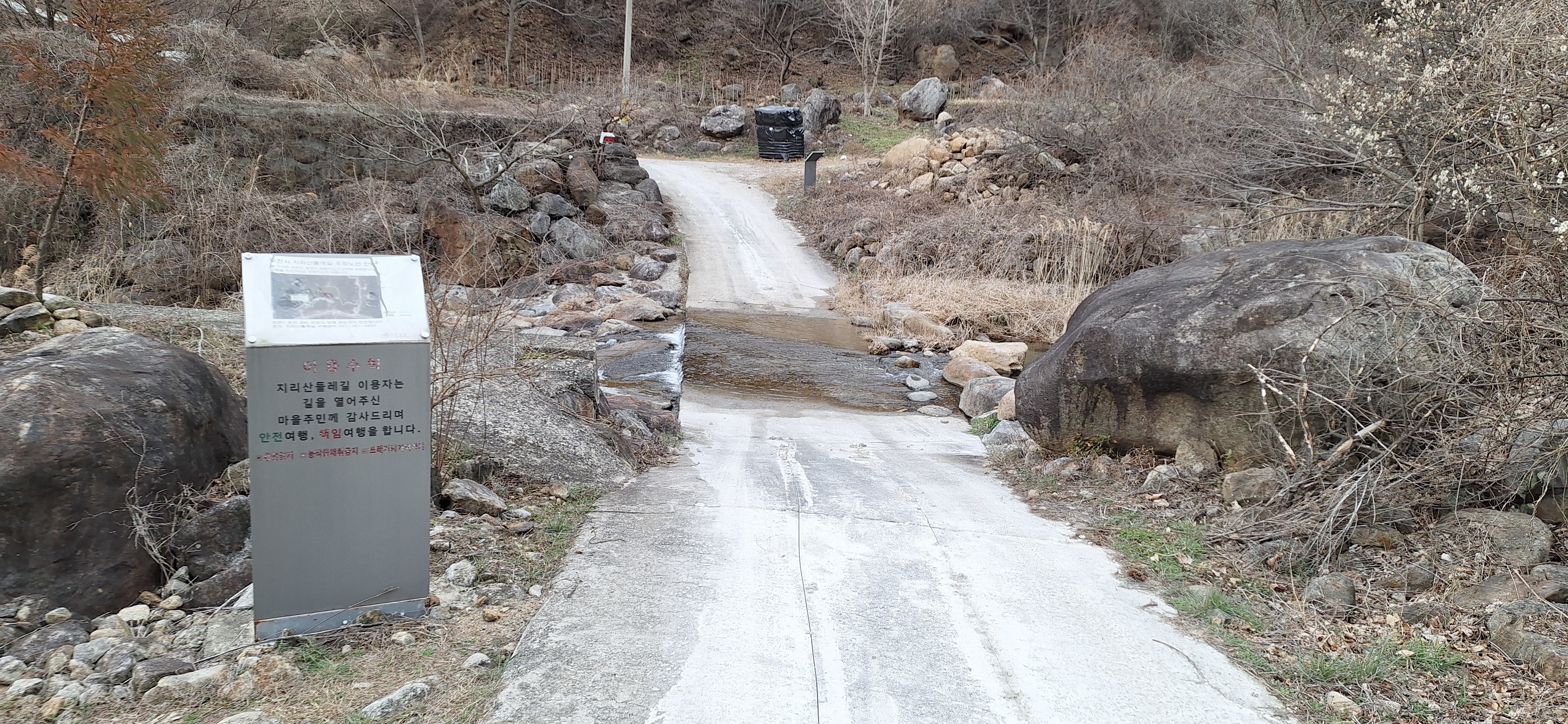 *개울을 건너 진행 개울에 물이 많을때는 우회로 이용 안내문.