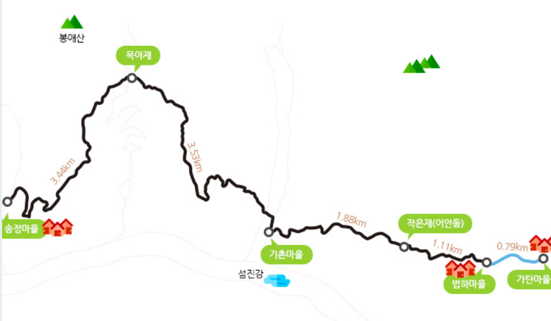 *코 스 = 가탄 – 법하(0.7km) – 작은재(어안동)(1.2km) – 기촌(1.9km) – 목아재(3.4km) – 송정(3.4km)