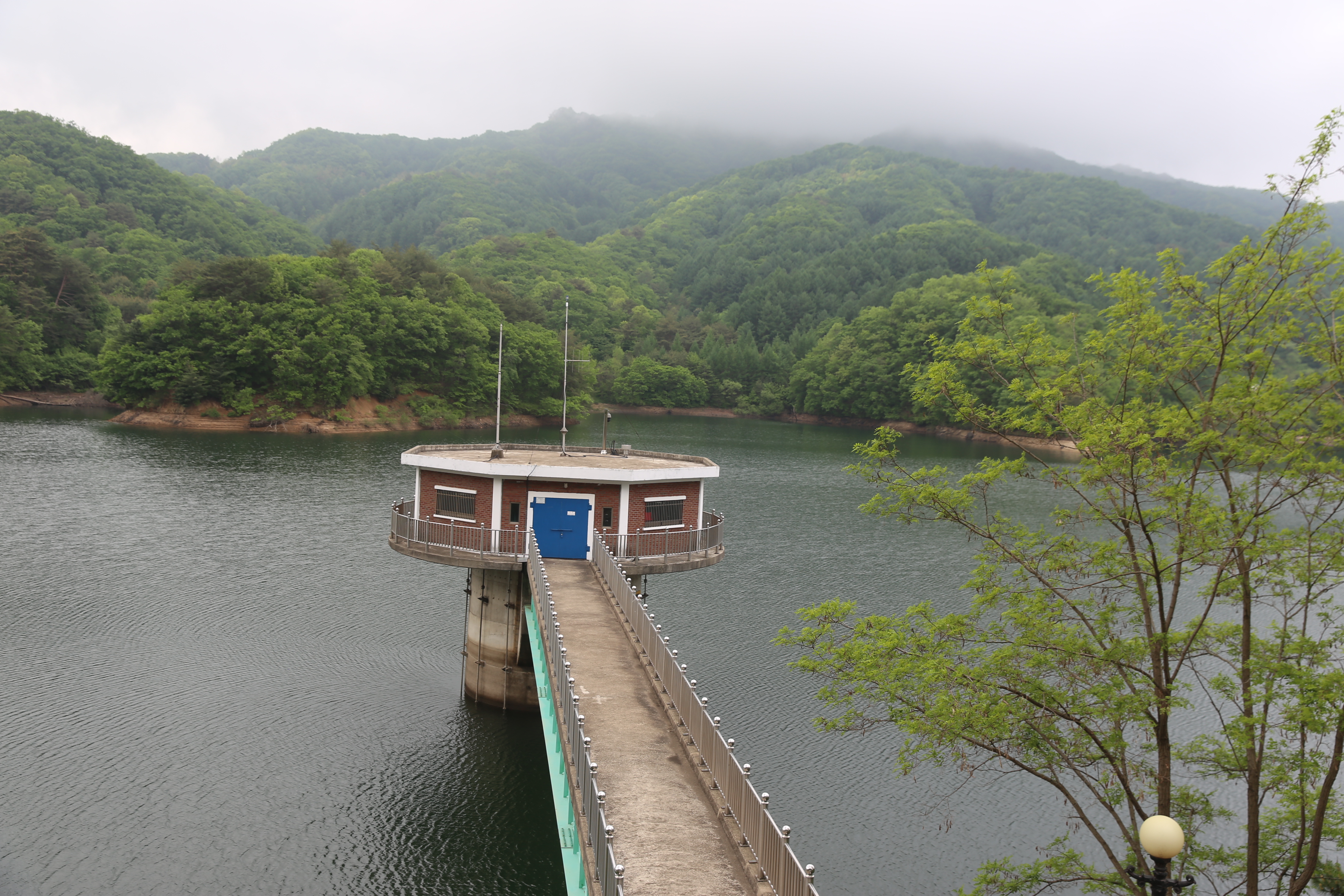 *잠곡호의 취수탑과 호수의 전경.